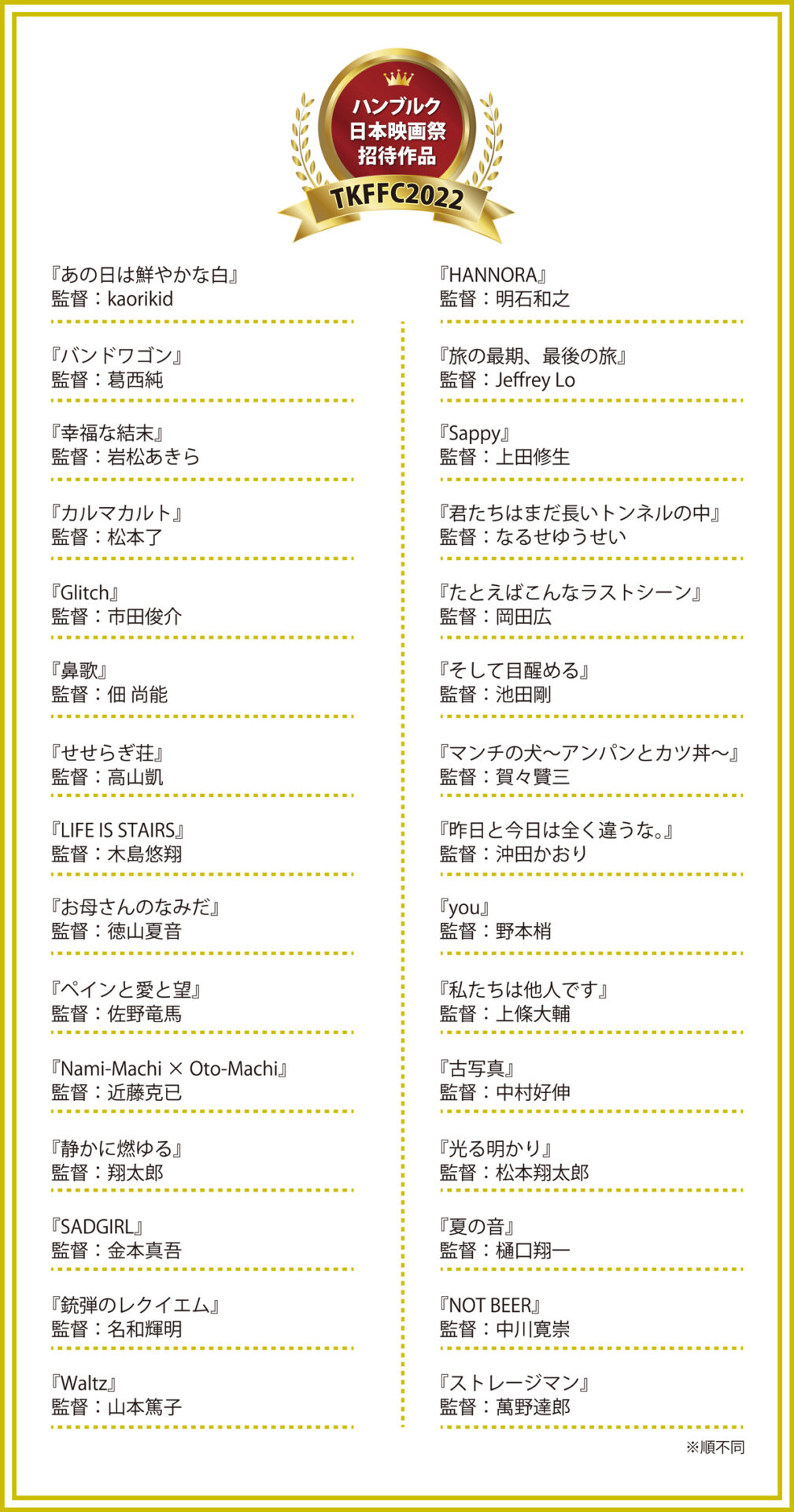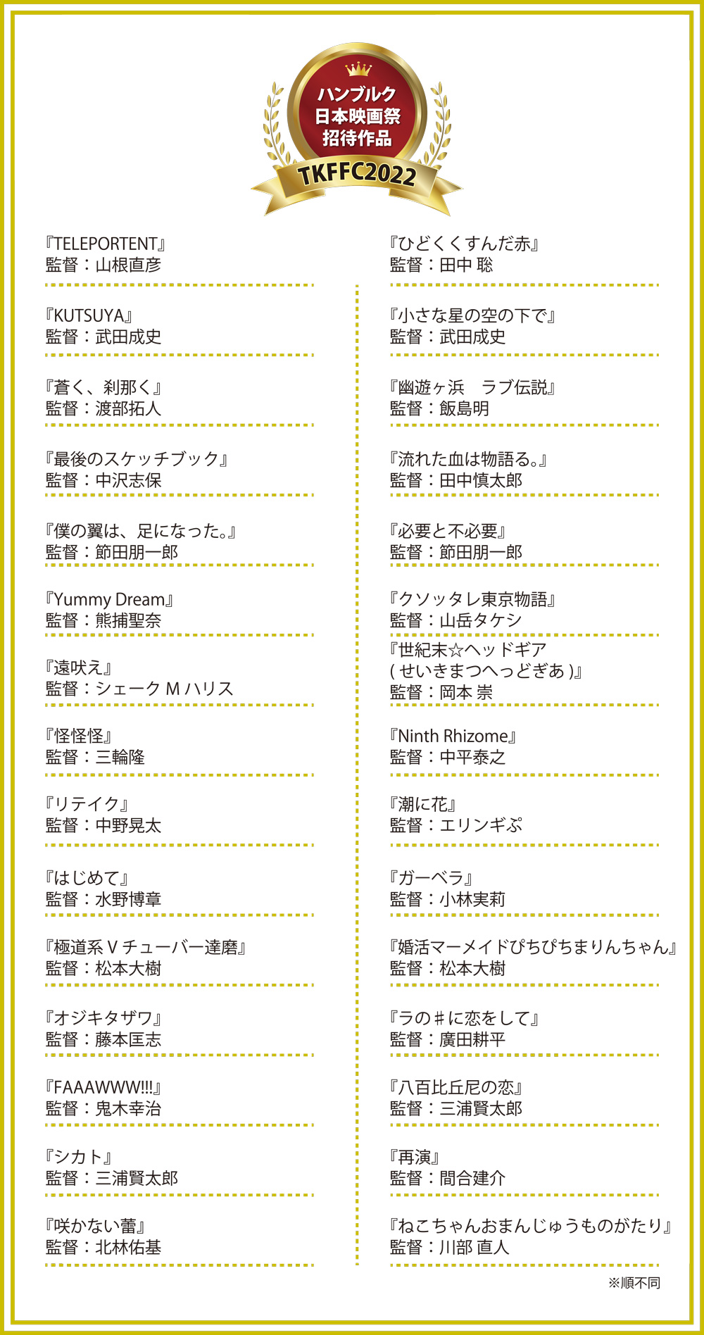 【TKFFC2022】ハンブルク日本映画祭招待上映60作品発表! 2024 3/30 新着情報 2023年2月20日2024年3月30日 いつも東京神田神保町映画祭を応援頂きありがとうございます。当映画祭の推薦により、2022年応募の中からハンブルルク日本映画祭での招待上映作品が選出されました!作品の監督及び関係の皆様、誠におめでとうございます! 新着情報 よかったらシェアしてね! URLをコピーしました! URLをコピーしました! プレイバックパート⑪【東京神田神保町映画祭特集】2/16(木)~3/1(水) TKFFC2022ノミネート6作品正式発表! この記事を書いた人 jmf 関連記事 【告知】第二回極東インディペンデント映画祭作品募集開始 2025年12月10日 【お知らせ】極東インディペンデント映画祭グランプリ発表 2025年12月1日 【お知らせ】極東インディペンデント映画祭ノミネート10作品発表のお知らせ 2025年11月10日 【お知らせ】第三回東京インディペンデント映画祭グランプリ・入選作品発表! 2025年10月5日 【お知らせ】第三回東京インディペンデント映画祭ノミネート5作品発表! 2025年10月1日 第二回東京インディペンデント映画祭受賞&ノミネート作品が「ABEMA」にて配信決定! 2025年10月1日 【お知らせ】ブルックリンサイファイフィルムフェスティバル2025推薦作品上映決定 2025年9月28日 【募集】イベントを通して、まちをもっと楽しく!一緒に創りませんか? 2025年9月24日