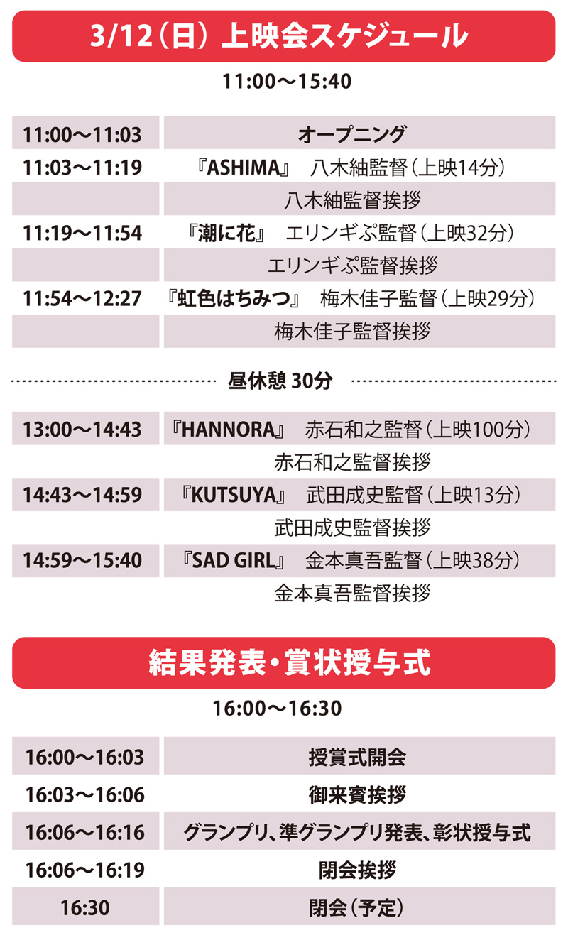 尚、グランプリ、準グランプリの発表に関しましては3月12日(日)授賞式にてノミネート作品の上映後に発表、各部門賞は授賞式後にHPにて発表いたします。人数制限がございますが、一般エントリーも受け付けておりますので下記応募フォームからご応募ください。ご参加おまちしております。
