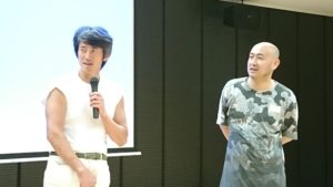 舞台挨拶でもまるでコントのように軽妙なやり取りを繰り広げたお2人。長回しで何回も撮って編集するという制作スタイルのお話や、実際にある店舗の倉庫を借りたという撮影のエピソード、“汗光る熱演”と思いきや、実際にとても暑いロケーションだったことなどをお話しいただきました。