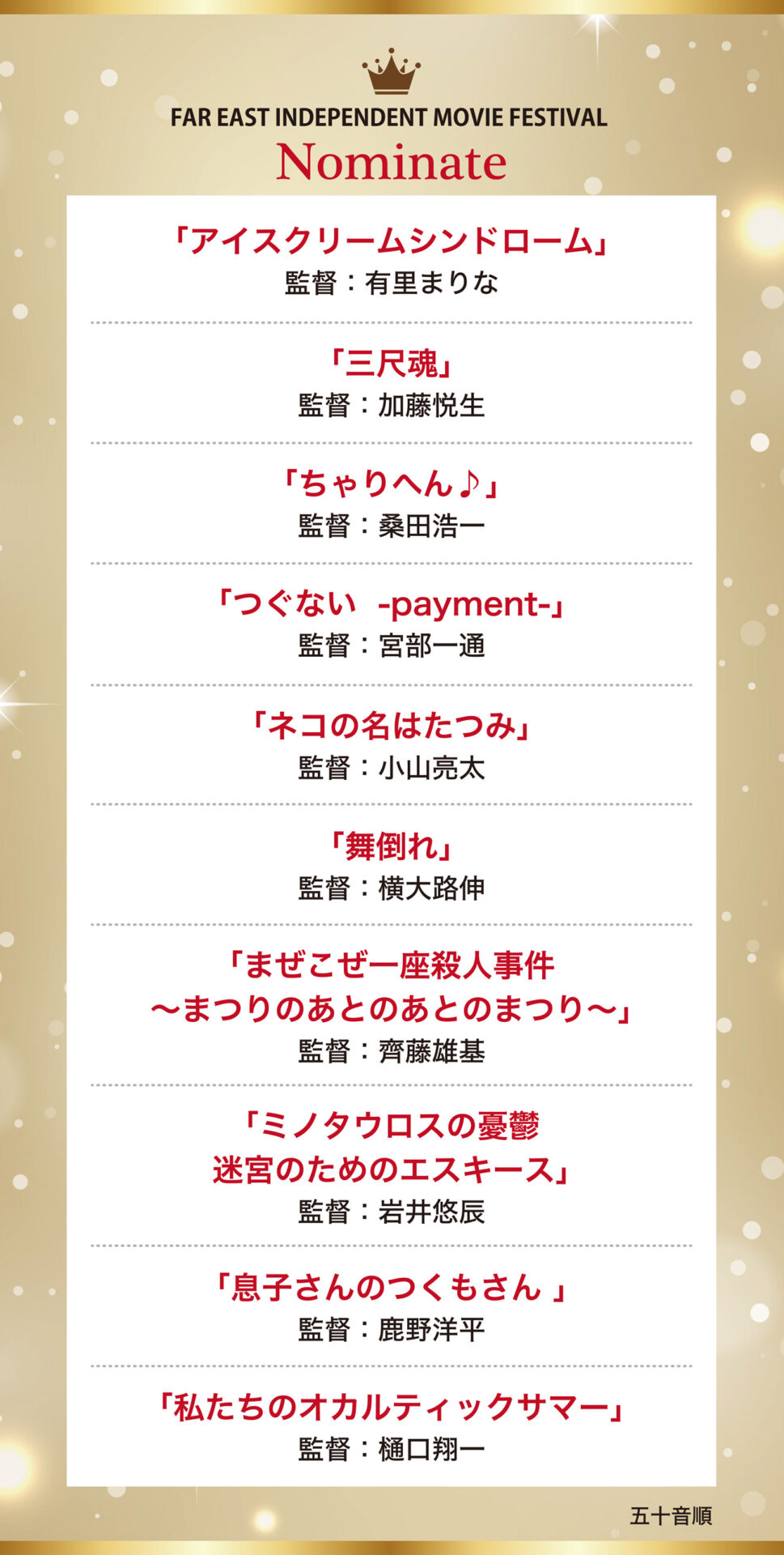 この度、ノミネート10作品が決定いたしましたのでここに発表いたします。 ノミネート作品選出の監督、関係者様誠におめでとうございます。 グランプリ作品はHPにて2025年12月1日の発表となります。